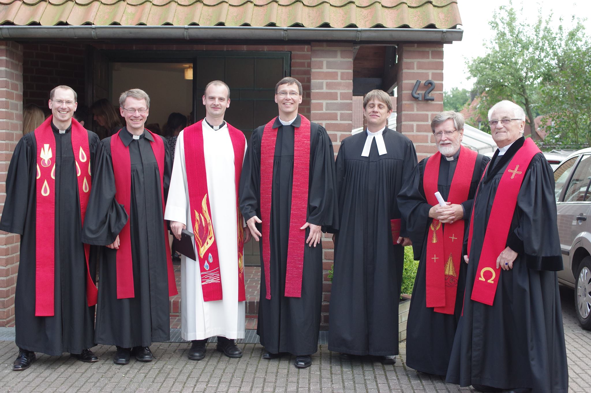 Der Einführungsgottesdienst war richtig klasse. Fetzige Musik, gute Verkündigung, bewegende Grußworte. Im Bild einige Beteiligte: Pastor Klaus Bergmann (Bildmitte) mit dem Einführenden Superintendent Bernhard Schütze (Hamburg | 2. von links). Es assistierten die Pfarrer Helge Dittmer (Kiel | 3. von rechts) und Christian Rehr (Stelle | 3. von links). Der Vorgänger im Pfarramt unserer Martin-Luther-Gemeinde, Eckhard Kläs (2. von rechts), wirkte auch mit.